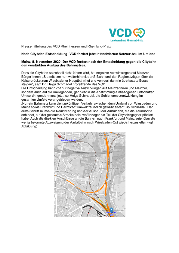 Dass die Citybahn so schnell nicht fahren wird, hat negative Auswirkungen auf Mainzer Bürger*innen. „Sie müssen nun weiterhin mit der S-Bahn und den Regionalzügen über die Kaiserbrücke zum Wiesbadener Hauptbahnhof und von dort dann in überlastete Busse steigen“, sagt Dr. Helga Schmadel, Vorsitzende des VCD.