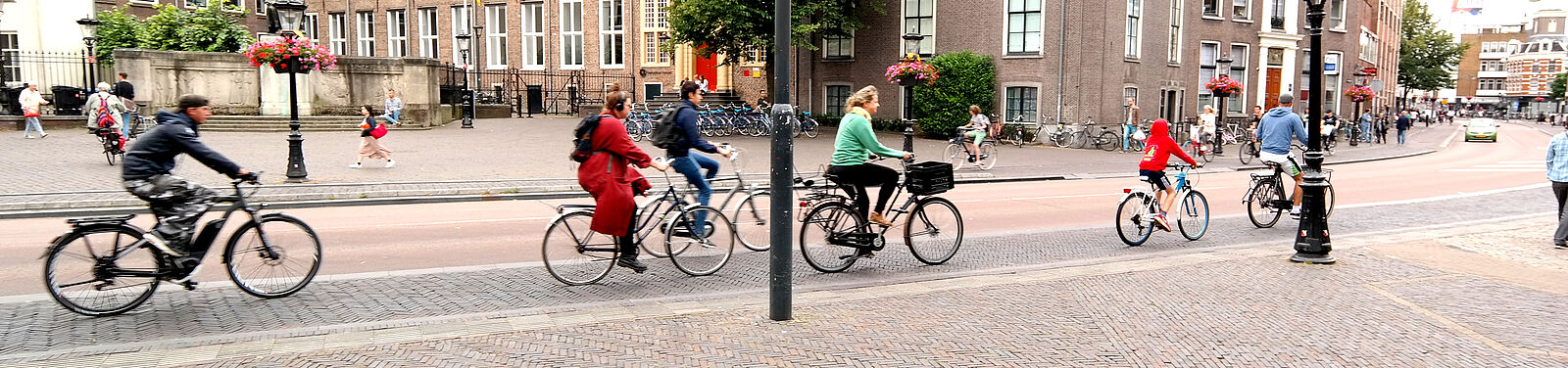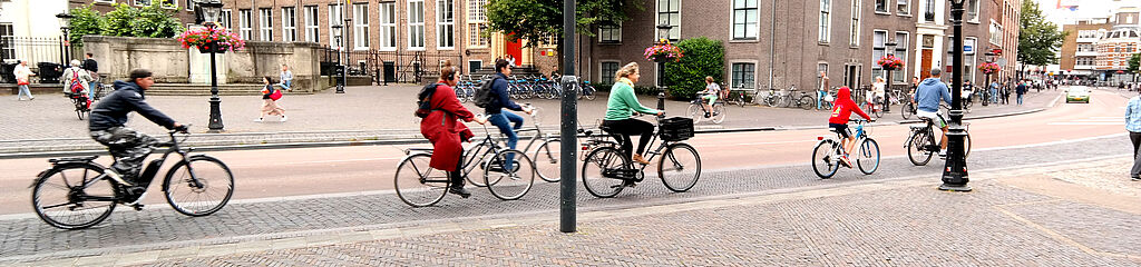 Aber nicht nur die Abstellmöglichkeiten für Räder sind knapp, auch auf den üppig ausgebauten Radwegen und Schutzstreifen reicht der Platz kaum für den Verkehr. Unsere Beobachtung: Für deutsche sicherheitsorientierte Radler fühlt sich das Fahren auf dem Radweg in Utrecht gefährlicher an als auf einer Mainzer Stadtstraße mit Höchstgeschwindigkeit 30 km/h. Selbstverständlich und wie auch angemessen fahren die Radelnden auf den 1,80m breiten Wegen auch zu zweit nebeneinander. Und dann wird man von Pedelecs oder Mopeds mit weniger als 50cm Abstand schnell überholt, eventuell fädeln sich noch weitere Fahrräder von rechts oder links auf den Radweg ein. Dabei trägt kein Alltagsradler einen Helm. Die Erläuterung der Hollandkundigen: Deutsche wollen nach Regeln fahren (und auf ihnen beharren). In den Niederlanden fährt man, indem man auf die anderen Verkehrsteilnehmer achtet und mit ihnen kommuniziert. Das heißt natürlich andersherum: Auch die schönsten „hollandesken“ Radwege allein werden uns kein niederländisch-entspanntes Verkehrserleben bescheren. Die Frage nach einer optimalen Radinfrastruktur in Deutschland löst sich nicht einfach mit der Parole, die holländische rein bautechnisch zu imitieren.