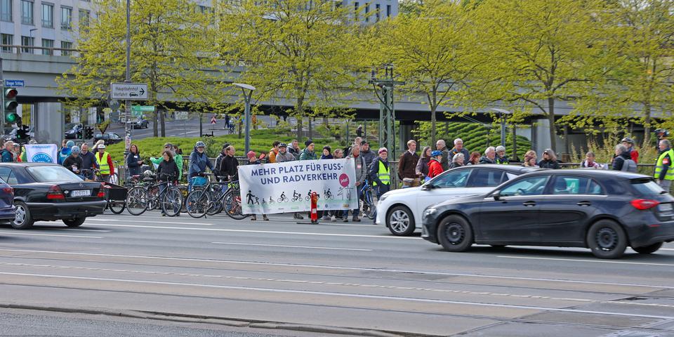 Rund 50 Menschen demonstrierten vergangenen Donnerstag für die Einrichtung einer geschützten Fahrradspur auf der Alicenbrücke und damit für mehr Gerechtigkeit bei der Aufteilung des öffentlichen Straßenraumes zu Gunsten von Fuß- und Radverkehr.