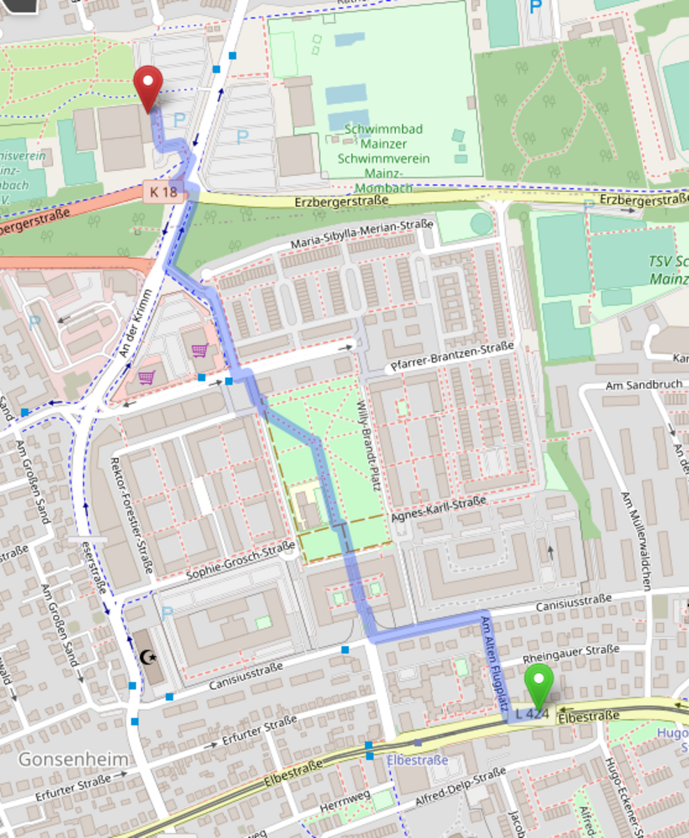 Oder Tram 50/51 Richtung Finthen Haltestelle Elbestraße (13 min ab Hbf), Fußweg (1km 14 min) wie im beigefügten Plan.