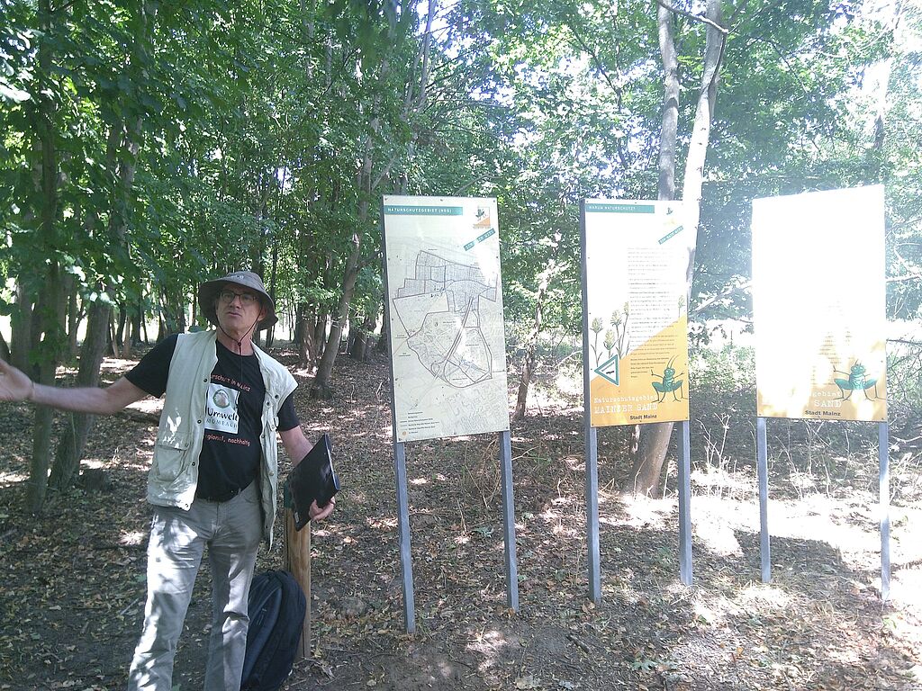Im Anschluss an die Zusammenkunft führte der Biologe Helmut Ludewig von der BI die Teilnehmer und etliche weitere Interessierte in das an Mombach angrenzende Gebiet und informierte über das Naturdenkmal und seine Gefährdung durch den geplanten sechsspurigen Ausbau der A643 zwischen dem Autobahndreieck Mainz und der Schiersteiner Brücke. „Eine einzigartige Pflanzen- und Tierwelt findet sich hier in einer nach der Eiszeit entstandenen mitteleuropäischen Sanddünenlandschaft und hat hier ihr letztes Rückzugsgebiet“, mahnte Ludewig. Zugleich diene es in seiner Naturbelassenheit der Naherholung der Mainzerinnen und Mainzer.