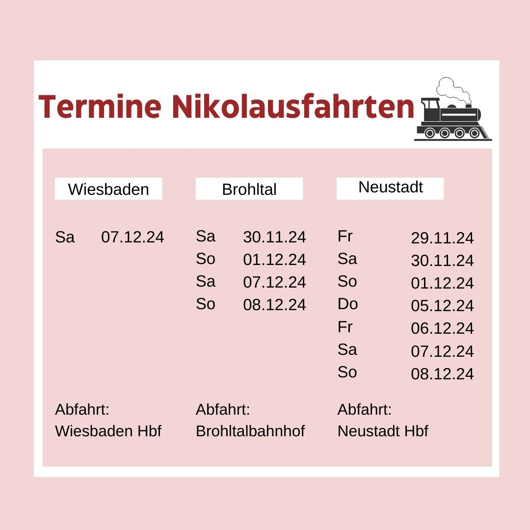 Auch in diesem Winter laden wieder zahlreiche Nikolausfahrten Familien und Kinder dazu ein, die Vorweihnachtszeit auf besondere Weise zu erleben. Es besteht die Möglichkeit in einem Zug, gezogen von einer nostalgischen Dampflok, mitzufahren. Bei manchen Fahrten steigt der Nikolaus mit ein und verteilt Geschenke an die kleinen Fahrgäste.