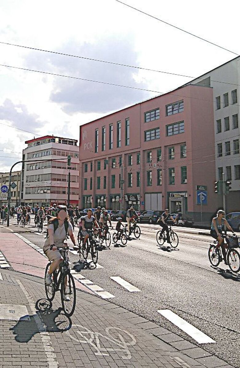 Mainz, 16.Juni 2023, spätnachmittags: Vorlesungsende auf der Uni, ganz viele Studis radeln auf einer breiten Fahrradspur zum Hauptbahnhof und in die Stadt? Schön wärs. An normalen Tagen fährt dort eine Autokolonne. Bei einer Fahrraddemo am Freitag forderten jedoch zweihundert Radelnde eine gerechte Raumzuweisung an den Radverkehr, gerade auch auf dieser Hauptroute.