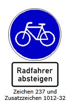 3. Das Zusatzzeichen ist an Radfahrer adressiert, bezieht sich also auf den Teil des Zeichen 240, das einen benutzungspflichtigen Radweg anordnet. Damit ist die Interpretation ähnlich wie oben bei Zeichen 237 mit dem Unterschied, dass nun die Abgestiegenen auf dem gleichen Weg schieben dürfen, wieder sofern dabei keine anderen Fußgänger erheblich behindert werden. Diese Einschränkung ist deswegen so zu betonen, weil Zeichen 1012-32 gerne als Baustellenbeschilderung verwendet wird, wo häufig nicht genug Platz auf dem Gehweg verbleibt.