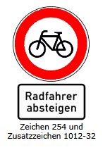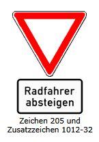 Das Zusatzzeichen 1012-32 soll häufig andeuten, dass eine Behörde nicht möchte, dass Radfahrer hier fahren. Möglicherweise wird damit versucht, die Amtshaftung nach einem Unfall an einer besonderen Gefahrstelle, die die Behörde erkannt, aber nicht beseitigt hat, auf die dort fahrenden Radfahrer abzuwälzen. Denn die Behörde kann in solch einem Fall darauf verweisen, dass sie ja angeordnet hätte, dass Radfahrer dort absteigen sollen. Dieser Vorhalt könnte Ihnen nach einem Unfall an einer durch Zusatzzeichen 1012-32 gekennzeichneten Stelle gemacht werden und auch Ihren Schuldanteil als Radfahrer bestimmen.