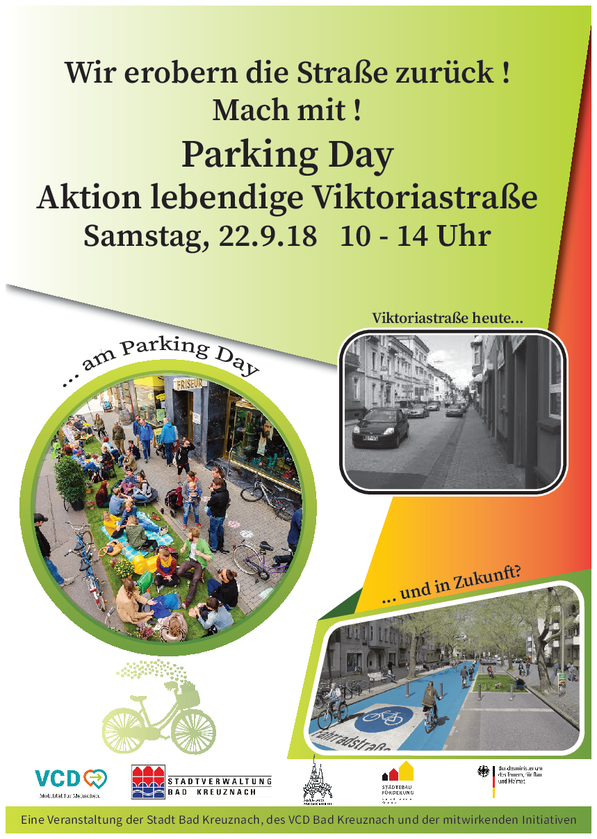 Am Samstag verwandelt sich eine Fahrbahn der Viktoriastraße in einen grünen und möblierten Treffpunkt für Jung und Alt. Mit Hochbeeten, Blumenkübeln und Bodenbelag entsteht Platz für die Bewohner des Viertels. Die Viktoriastraße wird dafür halbseitig gesperrt. Die Aktion "Parking Day -Lebendige Viktoriastraße“ wird von der Stadtverwaltung und dem Verkehrsclub Deutschland (VCD) Bad Kreuznach organisiert.
