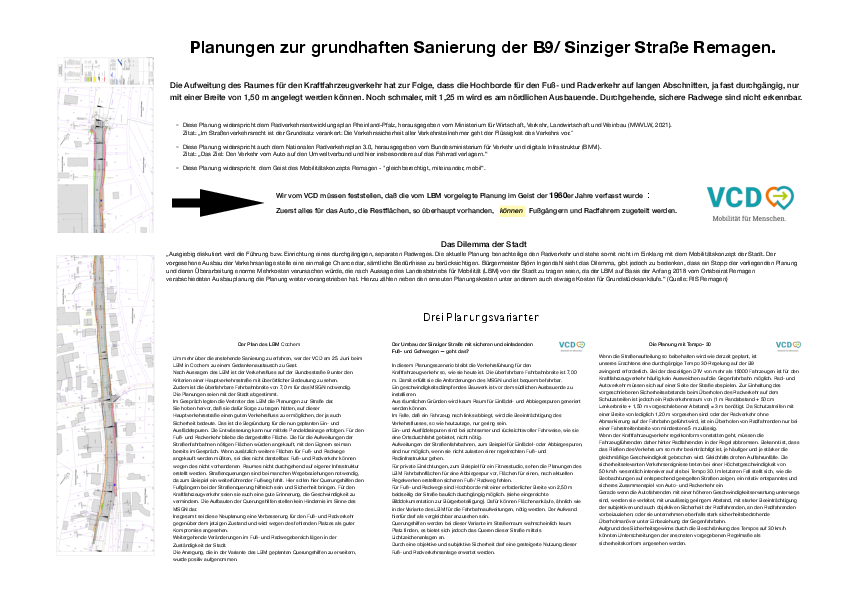 Die B9 / Sinziger Straße in Remagen soll erneuert werden. Die aktuellen Planungsvarianten halten die Richtlinien für Fuß- und Radverkehr jedoch nicht ein.