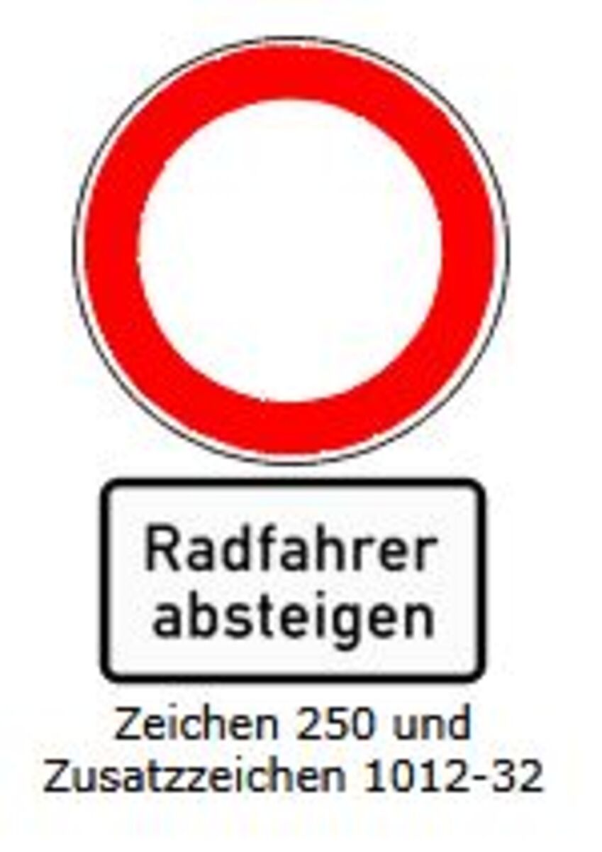 Aber "Radfahrer absteigen" ist ein Zusatzzeichen. Zusatzzeichen gelten nur in Verbindung mit einem Verkehrszeichen und zwar dem, das unmittelbar darüber steht. Alleine aufgestellt enthalten sie keine wirksame Anordnung. Sie gehören zu dem Verkehrszeichen darüber. Dessen Anordnungen verändern sie, sofern die StVO nichts anderes angibt (§ 41 Abs. 2 Sätze 4 bis 6 StVO). Zeichen 1012-32 ist nicht in der StVO angeführt, gehört also zu den ersteren Zusatzzeichen und "enthält nur allgemeine Beschränkungen der Gebote oder Verbote [eines Verkehrszeichens] oder allgemeine Ausnahmen von ihnen".