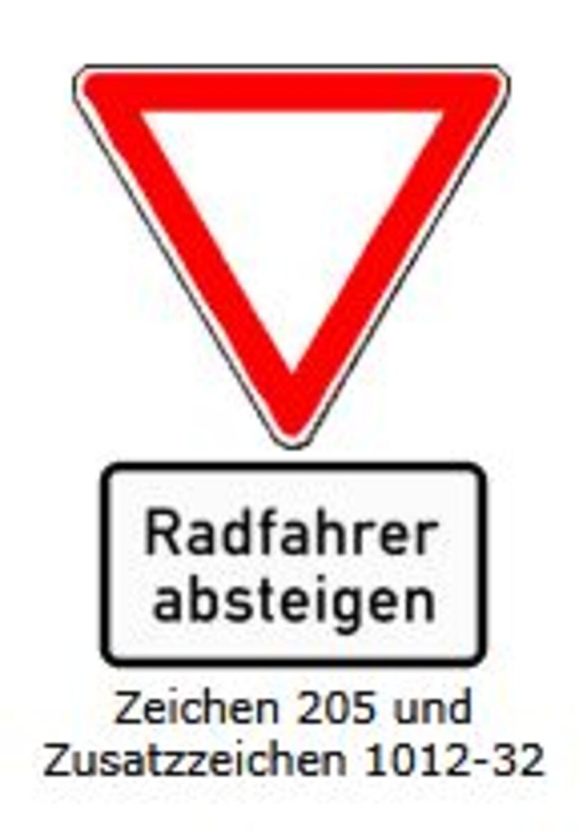 Radfahrer absteigen! Das klingt harsch. Zeichen 1012-32, wie das Schild offiziell heißt, kommt im Befehlston daher, obgleich man auf das Ausrufezeichen verzichtet hat. Sollte man nun dem Befehl Folge leisten? Das muss nicht sein.