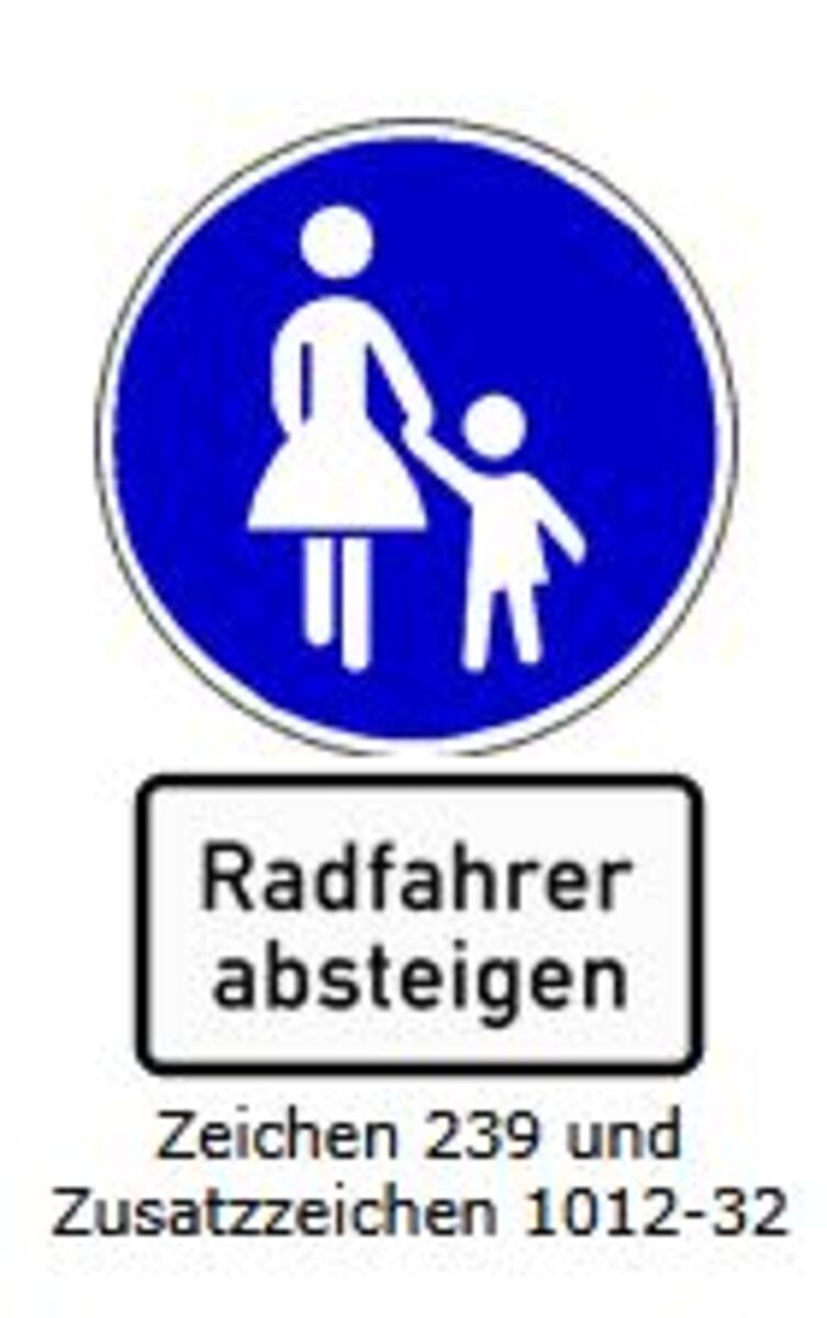 3. Das Zusatzzeichen ist an Radfahrer adressiert, bezieht sich also auf den Teil des Zeichen 240, das einen benutzungspflichtigen Radweg anordnet. Damit ist die Interpretation ähnlich wie oben bei Zeichen 237 mit dem Unterschied, dass nun die Abgestiegenen auf dem gleichen Weg schieben dürfen, wieder sofern dabei keine anderen Fußgänger erheblich behindert werden. Diese Einschränkung ist deswegen so zu betonen, weil Zeichen 1012-32 gerne als Baustellenbeschilderung verwendet wird, wo häufig nicht genug Platz auf dem Gehweg verbleibt.