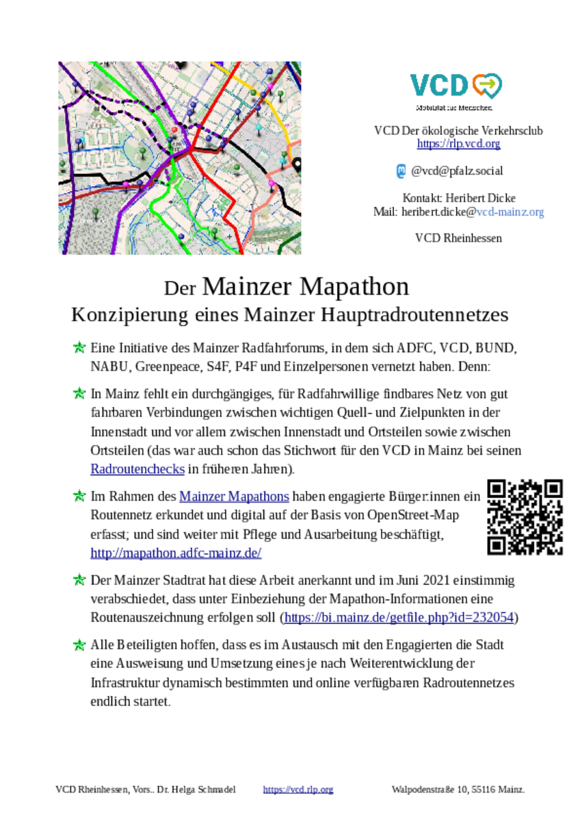 Im Rahmen des Mainzer Mapathons haben engagierte Bürger:innen ein Routennetz erkundet und digital auf der Basis von OpenStreet-Map erfasst; und sind weiter mit Pflege und Ausarbeitung beschäftigt. Der VCD beteiligt sich aktiv.