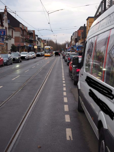 Für die Arbeitsgruppe „Gefahrstellen und Sicherheit im Radverkehr" des Mainzer Radfahrforums analysiert Gutmann seit Jahren Unfallzahlen, -orte und -ursachen. Aktuell geht es darum, welche Veränderungen sich 2025 ergeben haben und welche Auffälligkeiten fortbestehen, Vor einem Jahr wiesen zum Beispiel die Rheinallee Nord und Süd sowie die Breite Straße auffällige Unfallstellen und -situationen auf. Hier sind im Verlauf des Jahres 2025 weitere Radfahrunfälle hinzugekommen. In der Breiten Straße (siehe Foto) waren das insbesondere wieder sogenannte Dooring-Unfälle (Kollisionen mit Autotüren) sowie Stürze in Verbindung mit den Straßenbahnschienen.