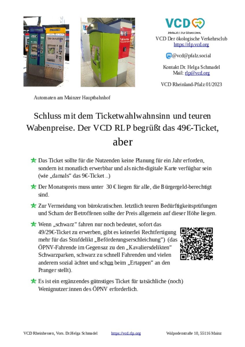 Der VCD RLP begrüßt das 49€-Ticket, aber das Ticket sollte für die Nutzenden keine Planung für ein Jahr erforden. Vielmehr sollte es monatlich erwerbbar und zusätzlich als nicht-digitale Karte verfügbar sein (wie „damals“ das 9€-Ticket ..)
