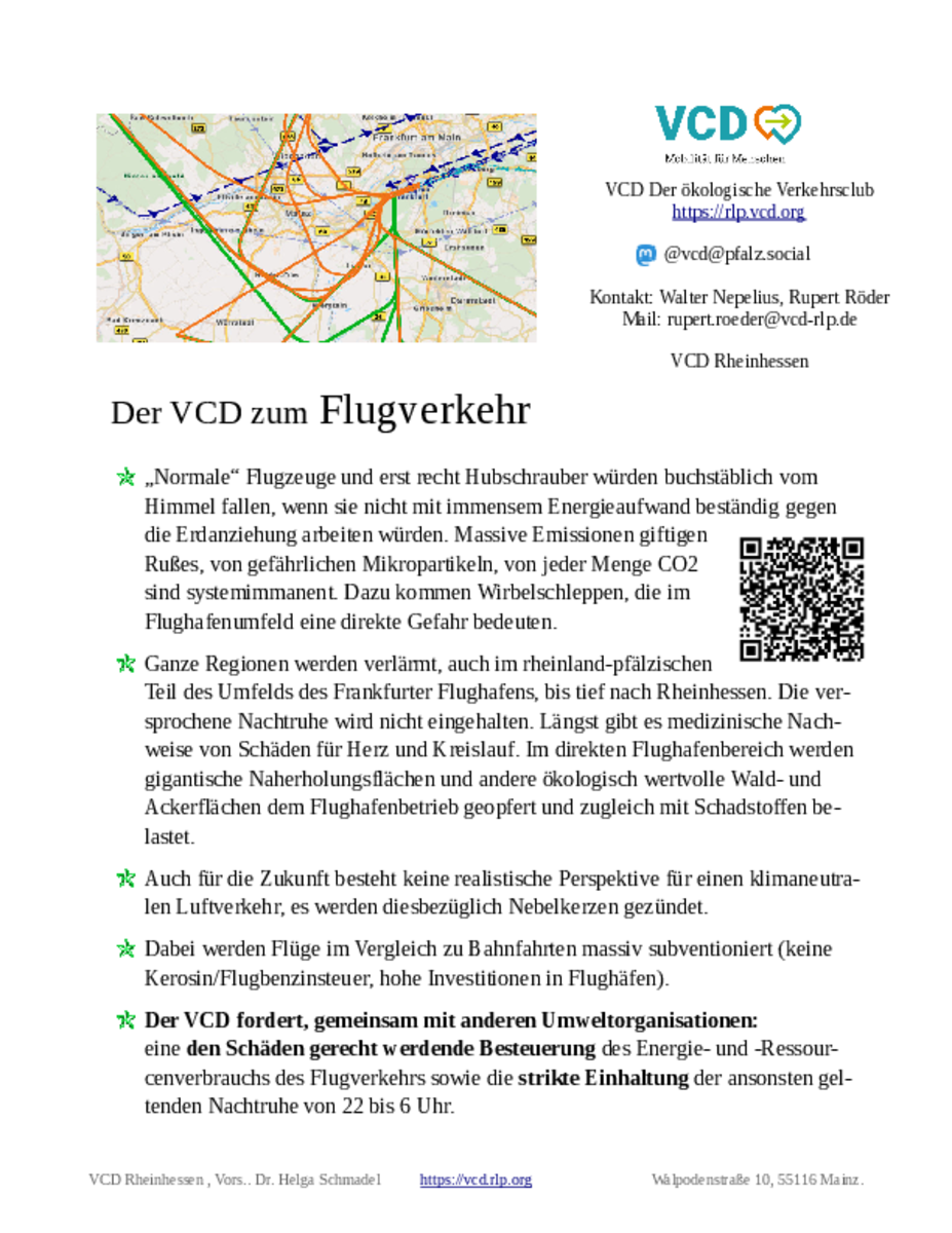 Der VCD fordert, gemeinsam mit anderen Umweltorganisationen: eine den Schäden gerecht werdende Besteuerung des Energie- und Ressourcenverbrauchs des Flugverkehrs sowie die strikte Einhaltung der ansonsten geltenden Nachtruhe von 22 bis 6 Uhr.